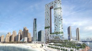 Jumeirah Gate is a mixed-use development consisting of twin towers with a built-up-area of approximately 225,000 sqm with a total height of 30-metres high respectively. The two 74-storey high-rise towers will include the branded five-star hotel with 182 rooms, 469 serviced apartments and 479 residential units, joint at the upper levels and topped with a roof top destination restaurant, bar and large infinity pool.